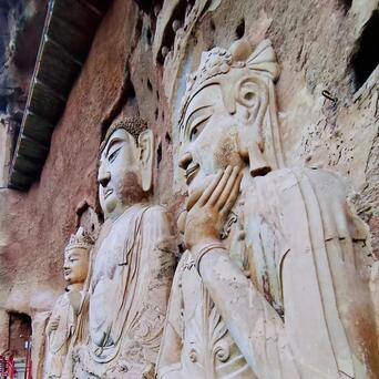 峭壁绝壁上雕凿着1600余年来的一万多身泥塑石雕及1300多平米壁画,每一尊佛像、每一幅壁画,皆在诉说着历史的沧桑与后光,被誉为“东方雕琢艺术摆设馆”。
