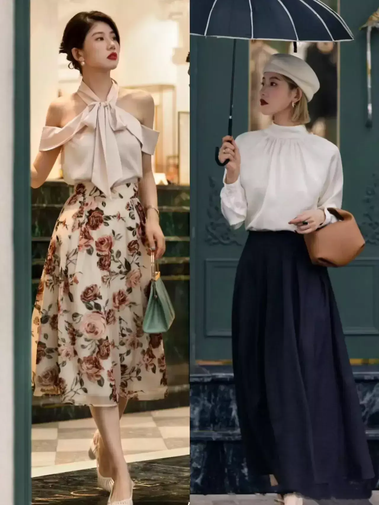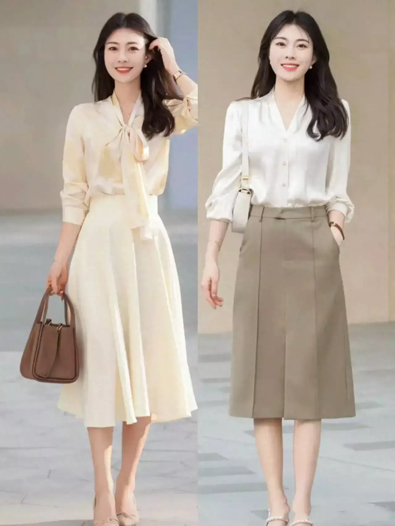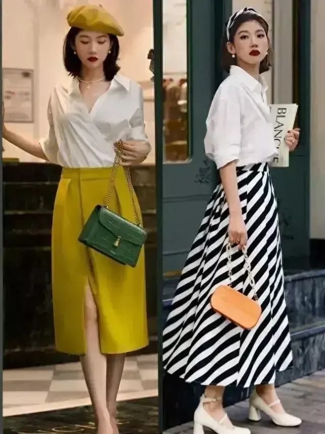 大家看底下这位博主接管了V领的衬衫上衣来搭配上伞状的半身裙,V领的项目能很好的展现出你锁骨的上风,又能修饰你的颈部线条,更修长领有天鹅颈,而况戴上缜密的小项链或者是珍珠项链来点缀,使得你扫数这个词东说念主变得更缜密。