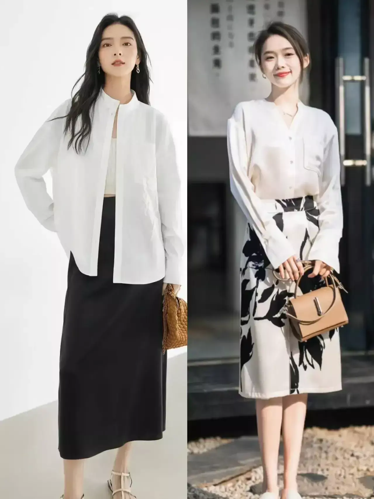 莫得底下博主就用立领的白色衬衫搭配上玄色的直筒半身裙,呈现出来的视觉氛围感就很干练。