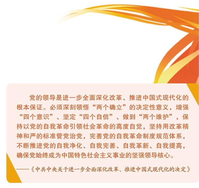 党的二十届三中全会强调,进一步全面深化校正要回想和应用校正通达以来尽头是新期间全面深化校正的珍视劝诫,贯彻对峙党的全面率领、对峙以东说念主民为中心、对峙守正创新、对峙以轨制建造为干线、对峙全面照章治国、对峙系统不雅念等原则。其中,“对峙党的全面率领”排在首位,是重中之重。全会审议通过的《中共中央对于进一步全面深化校正、鼓励中国式当代化的决定》(以下简称《决定》)提议,“强硬贯注党中央泰斗和采蚁合并率领,推崇党统领全局、协调各方的率领中枢作用,把党的率领聚拢校正各方面全进程,确保校正经久沿着正确政事方上前进”。对此,要负责学习认知、深入会通把抓、坚决贯彻落实。
